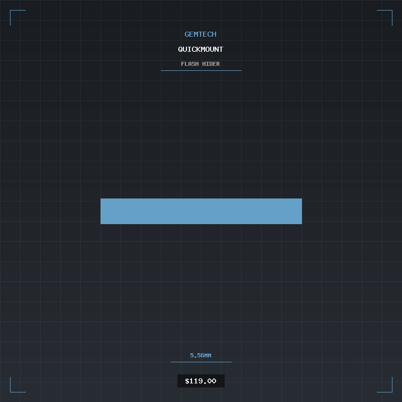 Gemtech Quickmount compatible flash hider for 5.56/.223 rifles with 1/2×28 thread pitch. Provides a solid mounting platform for Gemtech Quickmount suppressors. 17-4 PH stainless steel with QPQ finish.